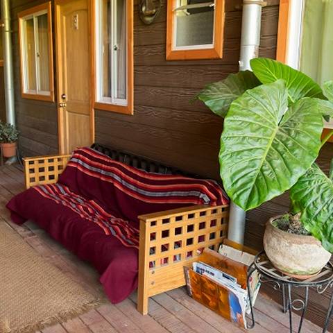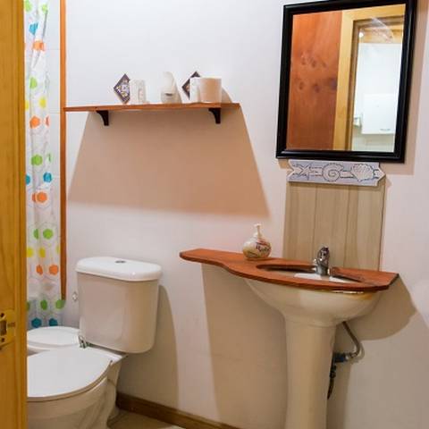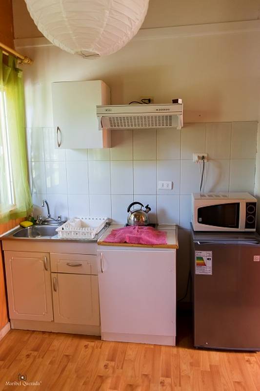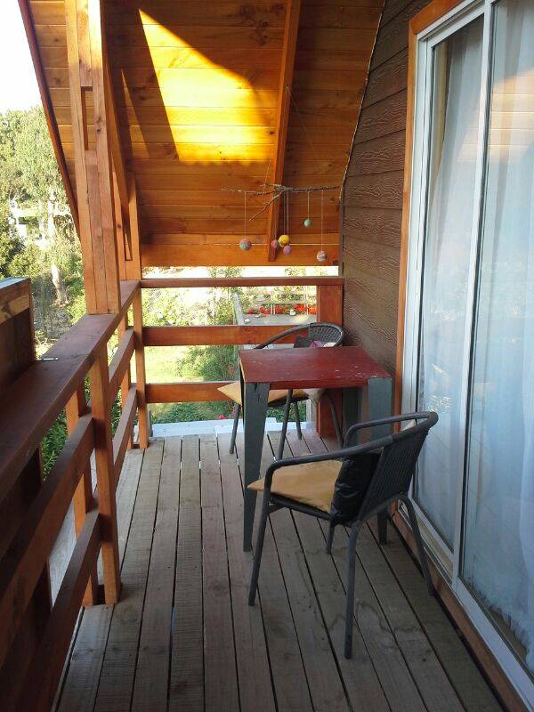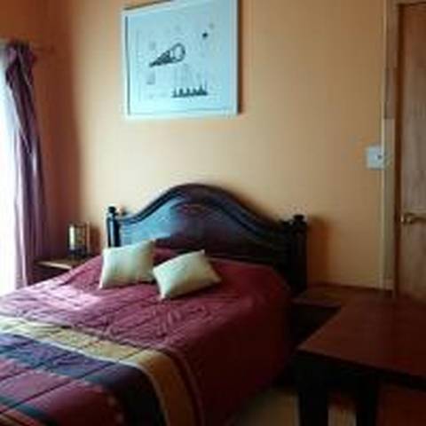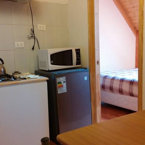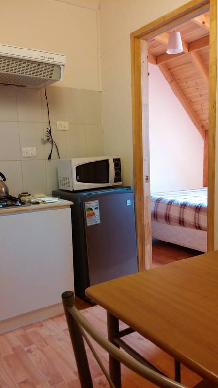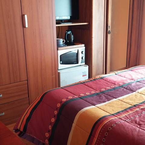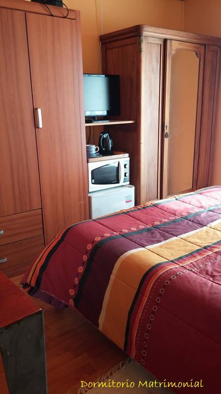 Dormitorio matrimonial con baño privado, refrigerador, hervidor, horno microondas, vajilla y losa para 2 personas, tv cable, terraza, sábanas y frazadas. No tiene cocina
